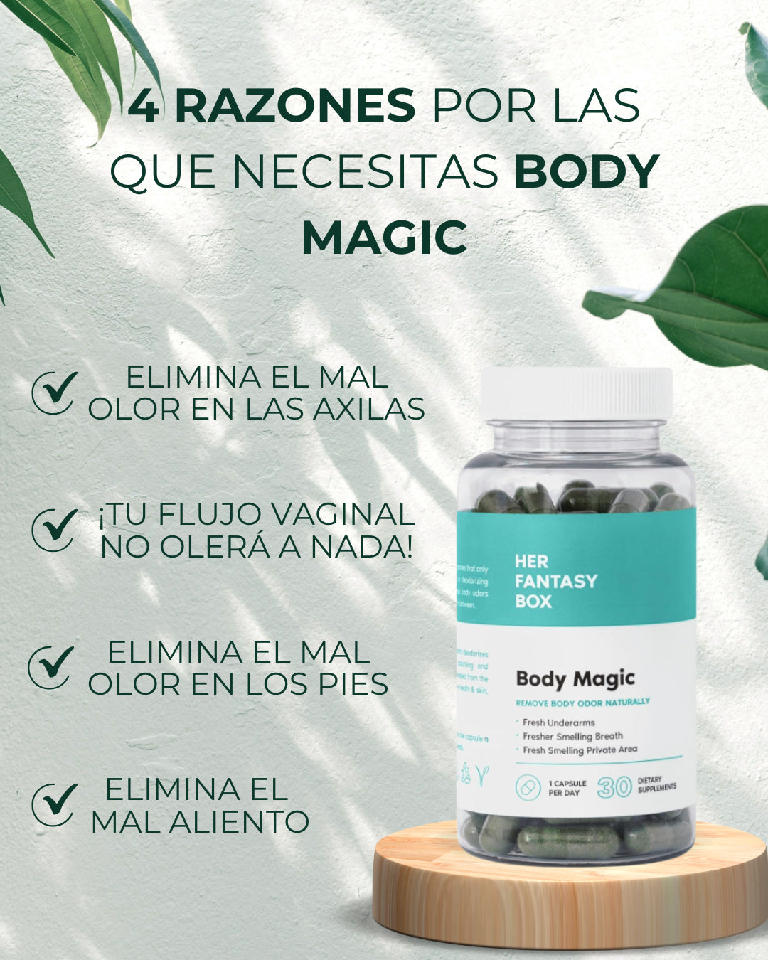 Body Magic es un suplemento innovador en cápsulas y desintoxicante natural que actúa desde adentro, formulado con clorofila concentrada de grado alimenticio, cuya eficacia para neutralizar los olores corporales ha sido científicamente validada en más de 5.000 usuarios con resultados consistentes, visibles y duraderos.
